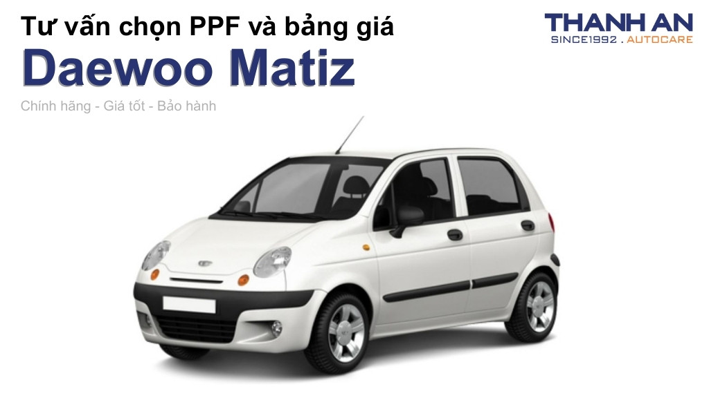 Bảng giá dán PPF xe ô tô Daewoo Matiz vô cùng đa dạng, đầu tư vào PPF cao cấp giúp cách nhiệt vượt trội, bảo vệ ngoại thất và tăng cường độ bền của sơn xe. Dưới đây là chi tiết!