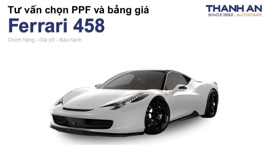 Nhằm bảo vệ nội và ngoại thất xe khỏi trầy xước, phai màu, dán PPF ô tô Ferrari 458 là giải pháp hiệu quả. Bạn muốn dán PPF cho chiếc Ferrari 458 của mình nhưng không biết PPF nào sẽ phù hợp? Trong bài viết này, Thanh An sẽ cung cấp cho bạn toàn bộ những kiến thức cần biết về dán PPF xe Ferrari 458 và mẹo để chọn được loại PPF tốt nhất.