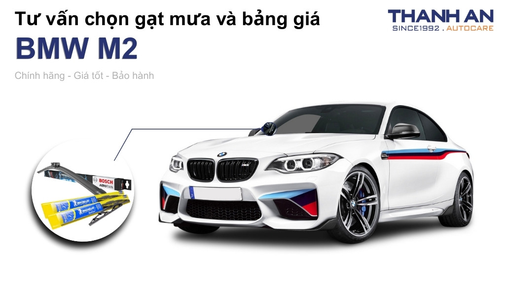 BMW M2 là dòng xe hiệu năng cao với thiết kế kính lái đặc thù nhằm tối ưu hóa khí động học. Sử dụng đúng kích thước gạt mưa là yếu tố kỹ thuật bắt buộc để đảm bảo lưỡi gạt bao phủ toàn bộ tầm nhìn mà không gây va chạm vào khung xe. Mỗi thế hệ BMW M2 sẽ có những thông số độ dài bên lái và bên phụ riêng biệt.