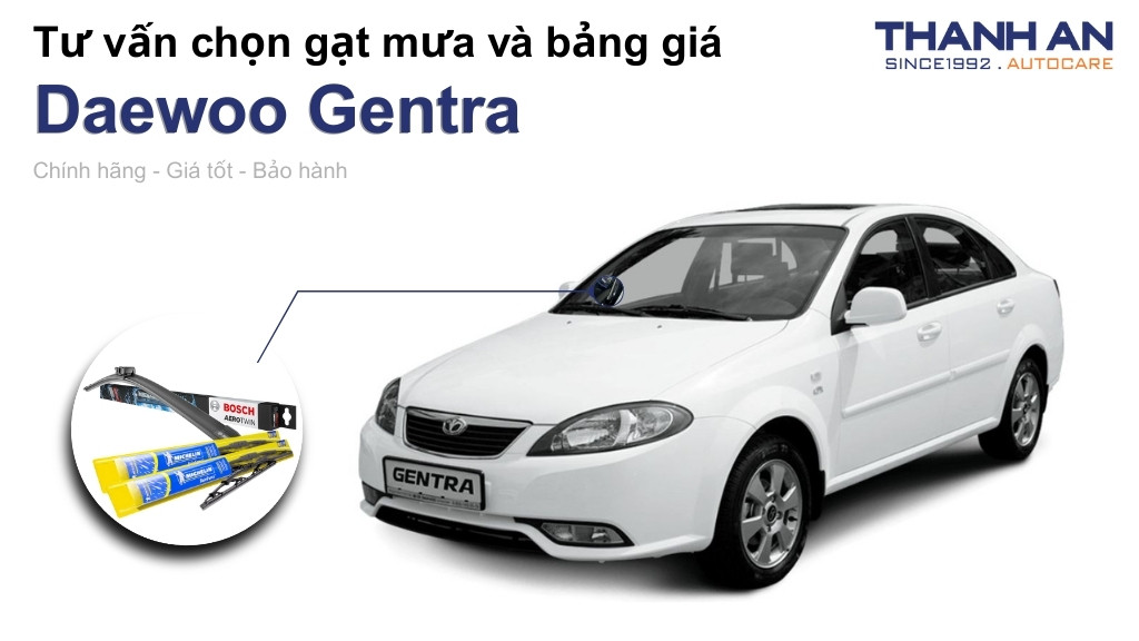- Điểm mạnh: Dòng Bosch Advantage (xương sắt) cực kỳ bền bỉ và kinh tế cho Daewoo Gentra. Dòng Bosch AeroTwin cao cấp hơn với công nghệ phủ Graphite giúp gạt trơn tru, không gây tiếng ồn.