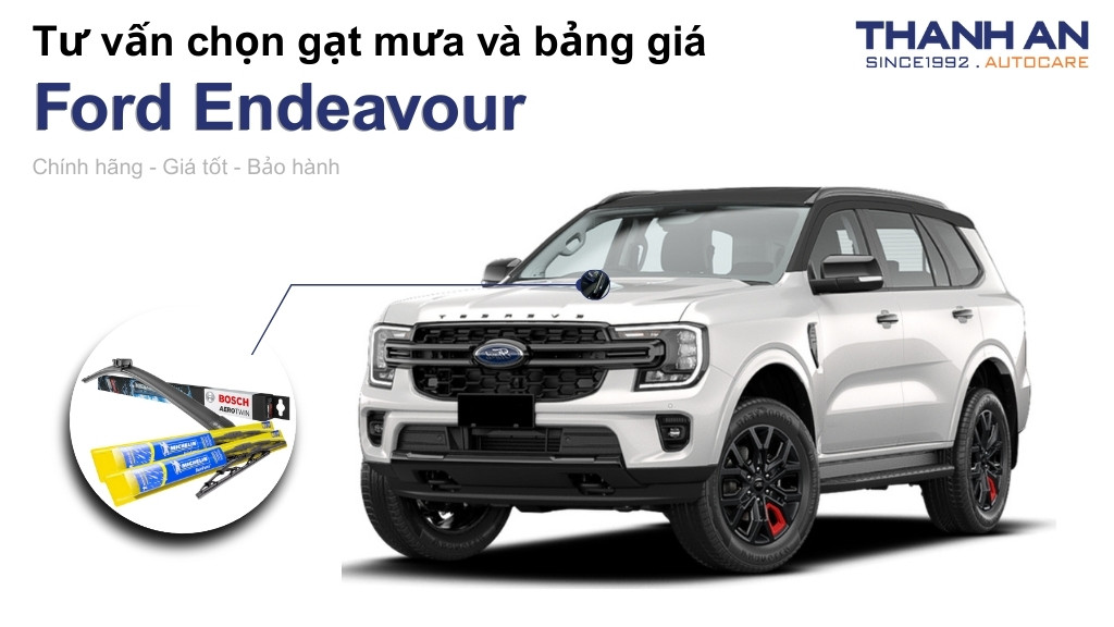 Sở hữu một chiếc SUV mạnh mẽ như Ford Endeavour đồng nghĩa với việc bạn thường xuyên chinh phục những cung đường khó khăn, nơi tầm nhìn sáng rõ là yếu tố sống còn. Thanh An Autocare hiểu rằng một bộ gạt mưa xe Ford Endeavour chất lượng kém sẽ gây ra tiếng ồn khó chịu và những vệt nước nguy hiểm trên kính lái. Hãy để chúng tôi giúp bạn chọn lựa sản phẩm tối ưu nhất giúp đảm bảo an toàn tuyệt đối cho mọi hành trình.