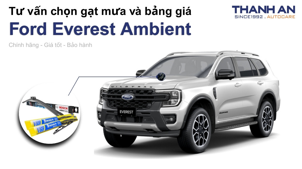 Bạn đang cầm lái chiếc SUV mạnh mẽ Ford Everest Ambient nhưng lại cảm thấy bất an vì tầm nhìn bị hạn chế mỗi khi trời đổ mưa? Hệ thống gạt mưa cũ kỹ, để lại vệt mờ hoặc phát ra tiếng kêu khó chịu chính là nguyên nhân làm giảm trải nghiệm lái xe và gây mất an toàn. Hãy cùng Thanh An Autocare tìm hiểu giải pháp gạt mưa xe Ford Everest Ambient tối ưu nhất, giúp trả lại mặt kính trong suốt và sự an tâm tuyệt đối trên mọi hành trình.