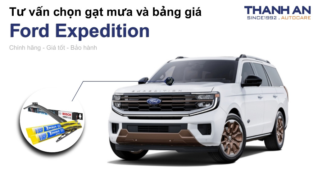 Ford Expedition là mẫu SUV cỡ lớn (Full-size SUV) với diện tích kính lái rất rộng. Việc chọn đúng kích thước là yếu tố kỹ thuật tiên quyết để đảm bảo cần gạt bao phủ tối đa tầm nhìn mà không gây va chạm vào gioăng cao su hoặc cột A.