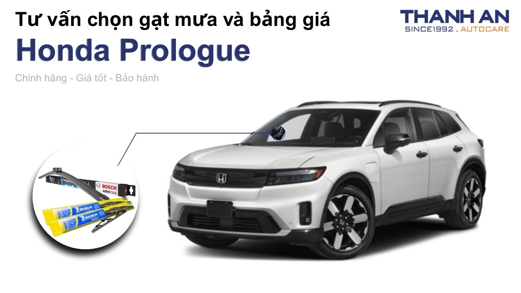 Thanh An Autocare là địa chỉ tin cậy chuyên cung cấp các dòng gạt mưa chính hãng Bosch, Michelin tại TP.HCM. Chúng tôi cam kết mang đến sản phẩm chuẩn kích thước, đúng mã cho dòng xe Honda Prologue của bạn.