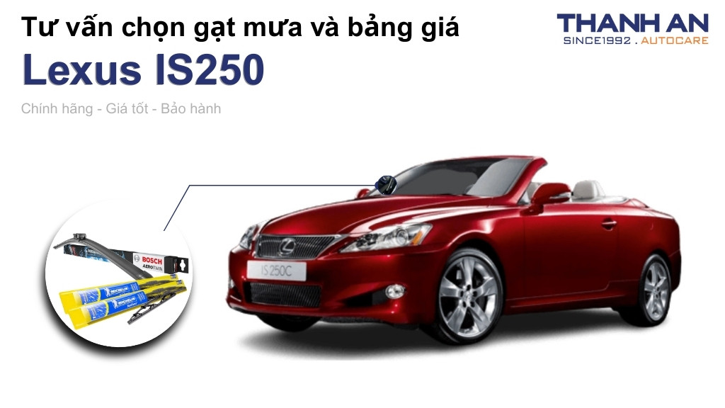 Đối với Lexus IS250, Thanh An Autocare khuyên bạn nên ưu tiên dòng Gạt mưa phẳng (Beam) hoặc Hybrid. Dòng xe này yêu cầu độ cách âm cao, việc sử dụng gạt xương sắt giá rẻ sẽ gây tiếng ồn gió khó chịu.
