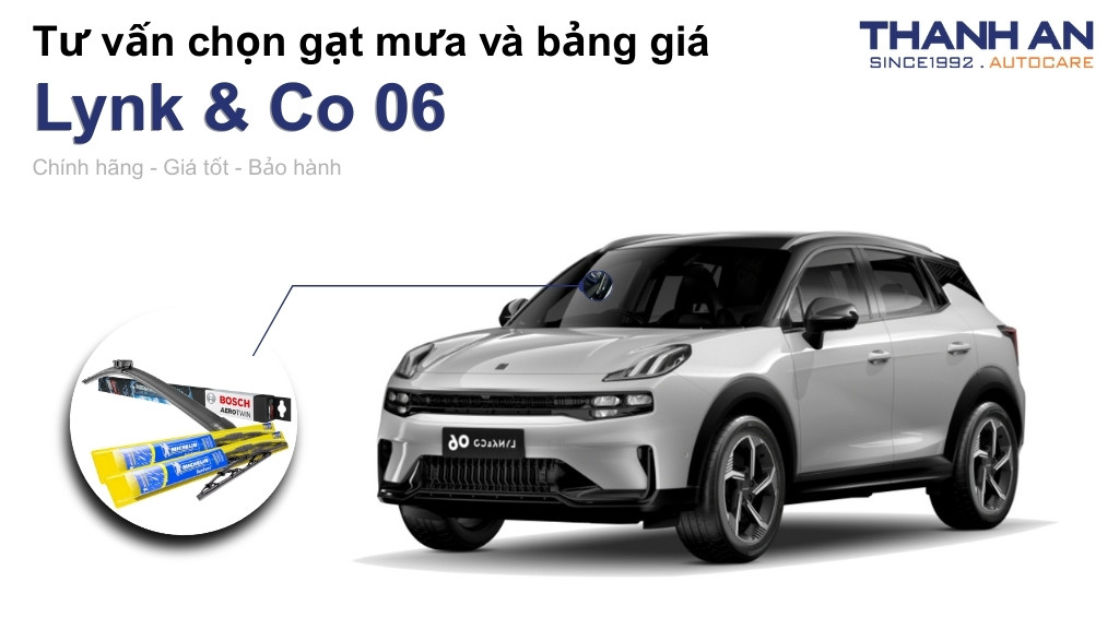- Điểm mạnh: Dòng Bosch AeroTwin là lựa chọn số 1 cho Lynk & Co 06. Sản phẩm có hệ thống Adapter thông minh lắp vừa hầu hết các chấu cài đặc biệt và lưỡi gạt phủ Nano Graphite siêu êm.