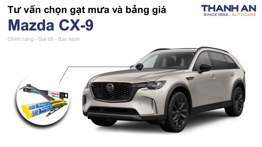 Xe Mazda CX-9 thường yêu cầu loại gạt mưa có thiết kế khí động học tốt để phù hợp với tốc độ di chuyển và độ cong kính lái. Thanh An Autocare khuyến nghị khách hàng nên ưu tiên dòng gạt mưa thân mềm (Beam) hoặc Hybrid.