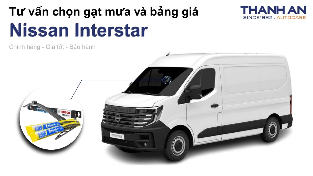 Đối với dòng xe Nissan Interstar chuyên chở hàng hóa và chạy đường dài, Thanh An Autocare khuyên bạn nên sử dụng Gạt mưa khung sắt (như Bosch Advantage). Lý do là dòng này có lực đè mạnh, giúp gạt sạch nước mưa lớn và bụi bẩn bám chặt trên kính, đồng thời chi phí thay thế rất kinh tế.