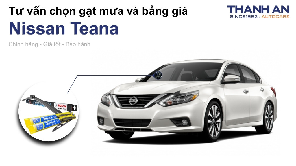 Nissan Teana là dòng sedan hạng D hướng đến sự êm ái và cách âm tốt. Do đó, bạn nên ưu tiên sử dụng gạt mưa thân mềm (Beam) hoặc Hybrid để giảm thiểu tiếng ồn gió khi chạy cao tốc.