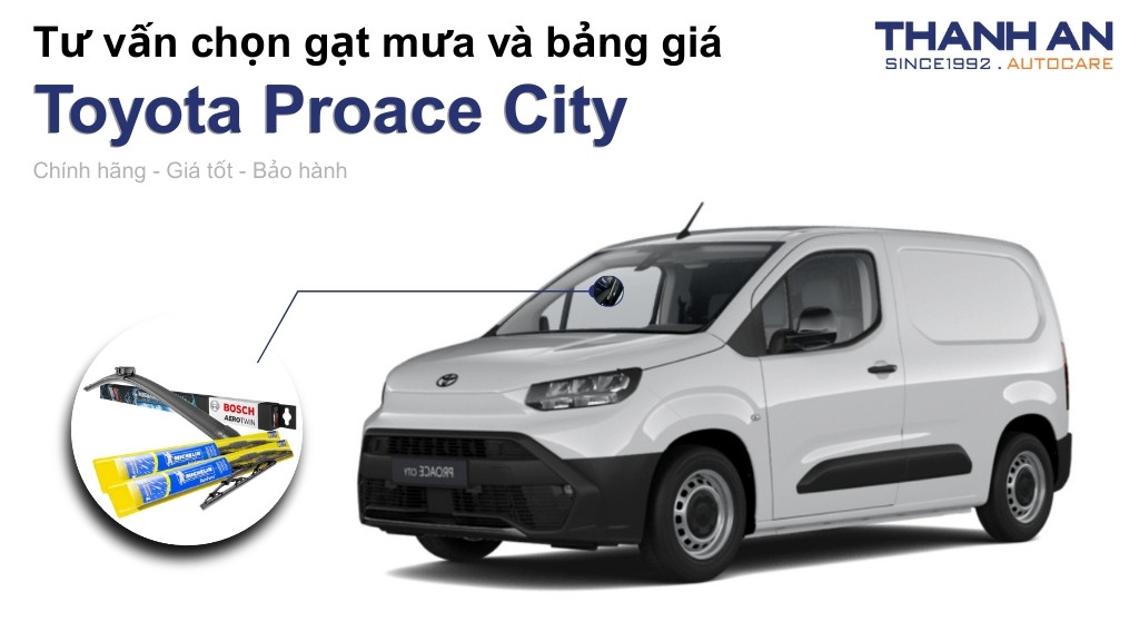 Bạn đang tìm kiếm giải pháp giúp kính lái luôn trong suốt để đảm bảo an toàn tuyệt đối cho những chuyến hàng quan trọng? Sở hữu bộ gạt mưa xe Toyota Proace City chất lượng cao là yếu tố tiên quyết giúp tài xế làm chủ tầm nhìn dưới mọi điều kiện thời tiết. Hãy cùng Thanh An Autocare phân tích và lựa chọn sản phẩm tối ưu nhất cho dòng xe MPV đa dụng này ngay sau đây.