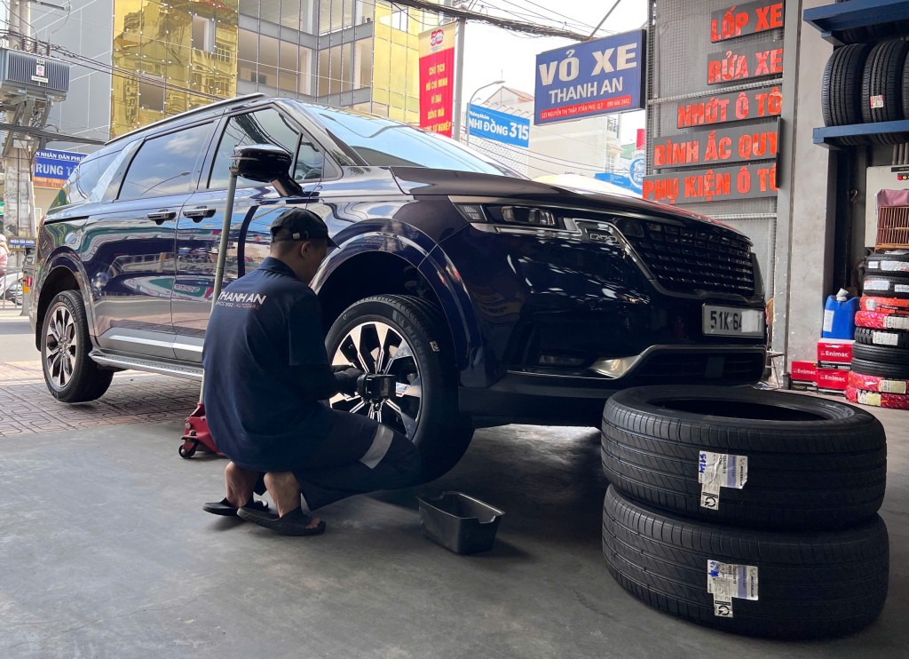 Khách hàng thay lốp xe ô tô tại cửa hàng của Thanh An Autocare quận 7