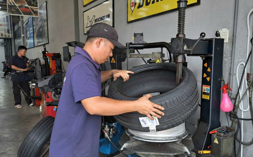 Khách hàng thay lốp xe ô tô tại cửa hàng của Thanh An Autocare quận 7