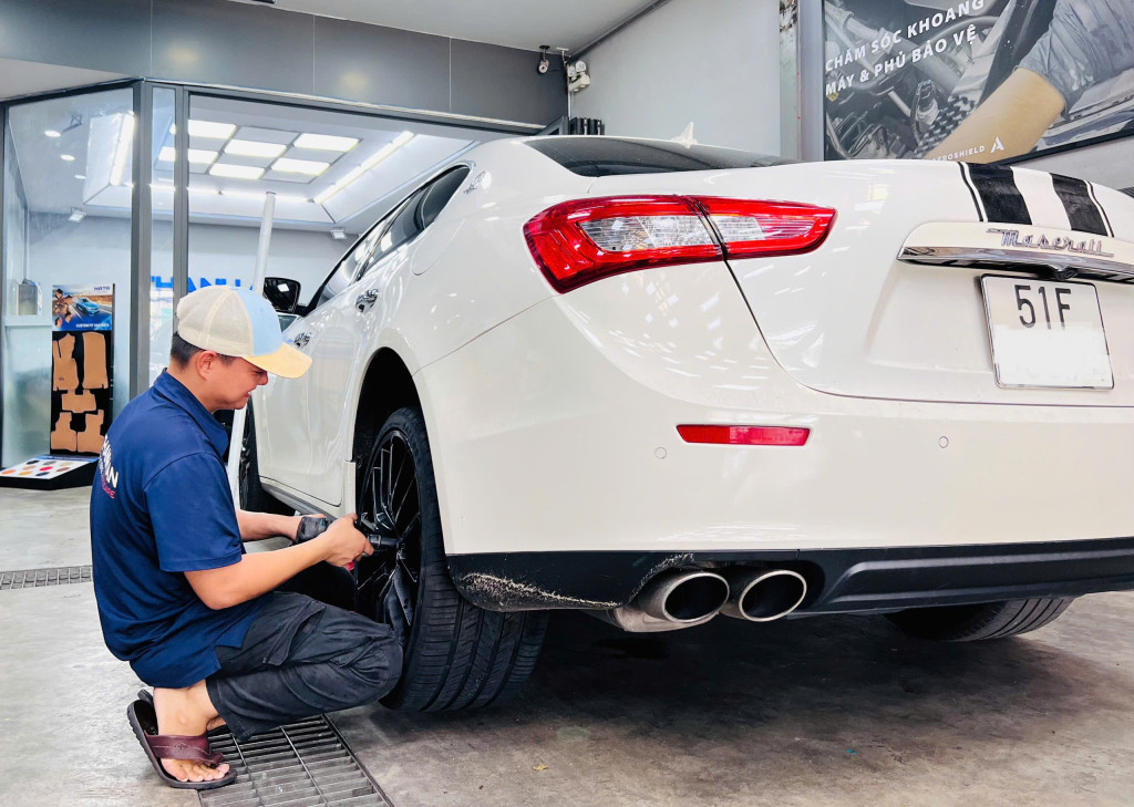 Khách hàng thay lốp xe ô tô tại cửa hàng của Thanh An Autocare quận 7
