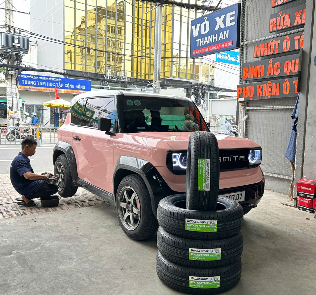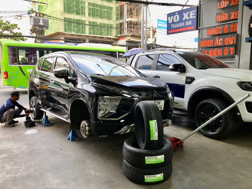 Kỹ thuật viên thay lốp cho xe Bridgestone tại quận 7