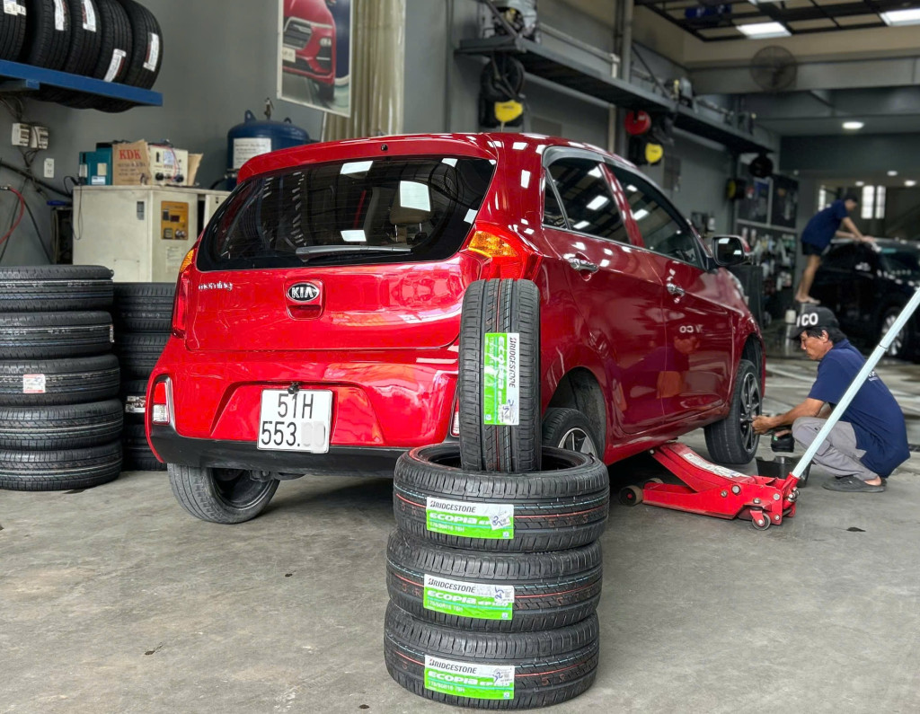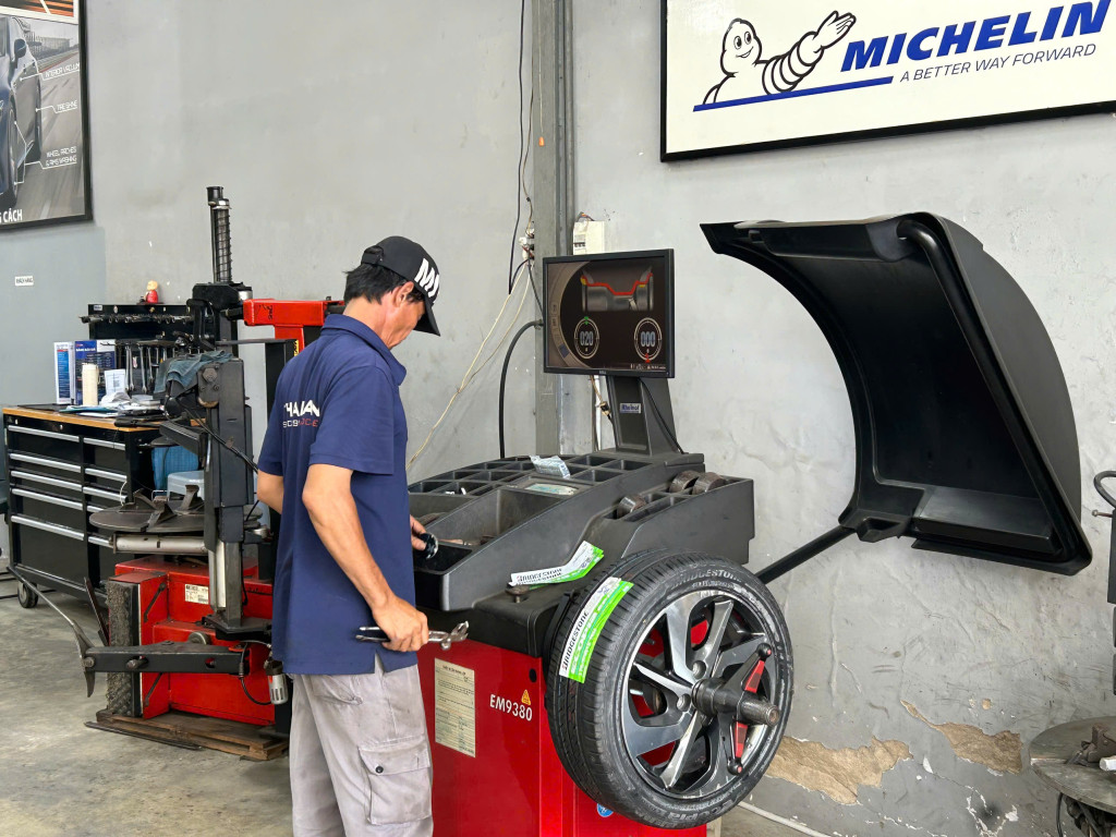 Khách hàng thay lốp xe ô tô tại cửa hàng của Thanh An Autocare quận 7