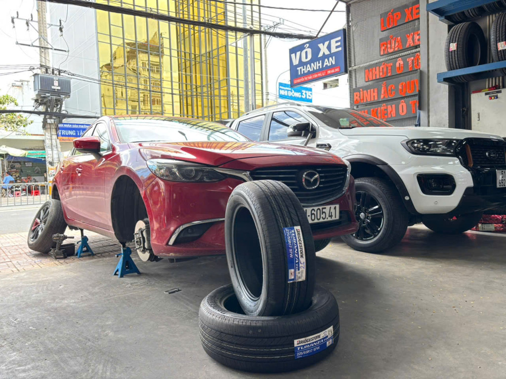 Khách hàng thay lốp xe ô tô tại cửa hàng của Thanh An Autocare quận 7