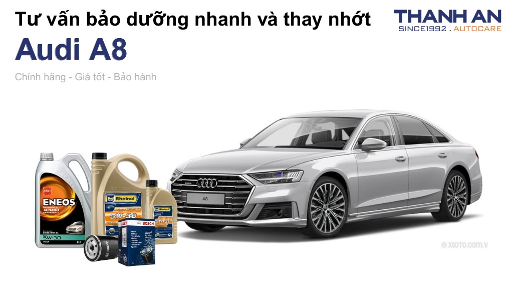 - Xe Audi A8 thay nhớt hãng hay nhớt ngoài tốt hơn? Thay nhớt tại Thanh An Autocare sử dụng sản phẩm chính hãng (Castrol, Mobil 1, Rheinol...) như trong hãng nhưng với chi phí tối ưu hơn và thời gian chờ đợi ngắn hơn.