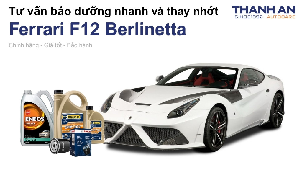 Với động cơ hoạt động ở vòng tua cực cao (redline 8.700 vòng/phút), Ferrari F12 Berlinetta cần loại dầu nhớt có độ bền màng dầu vượt trội và khả năng chịu nhiệt cực tốt. Thanh An Autocare khuyến nghị chủ xe sử dụng các dòng nhớt tổng hợp toàn phần (Fully Synthetic) từ các thương hiệu danh tiếng như Rheinol và ENEOS.