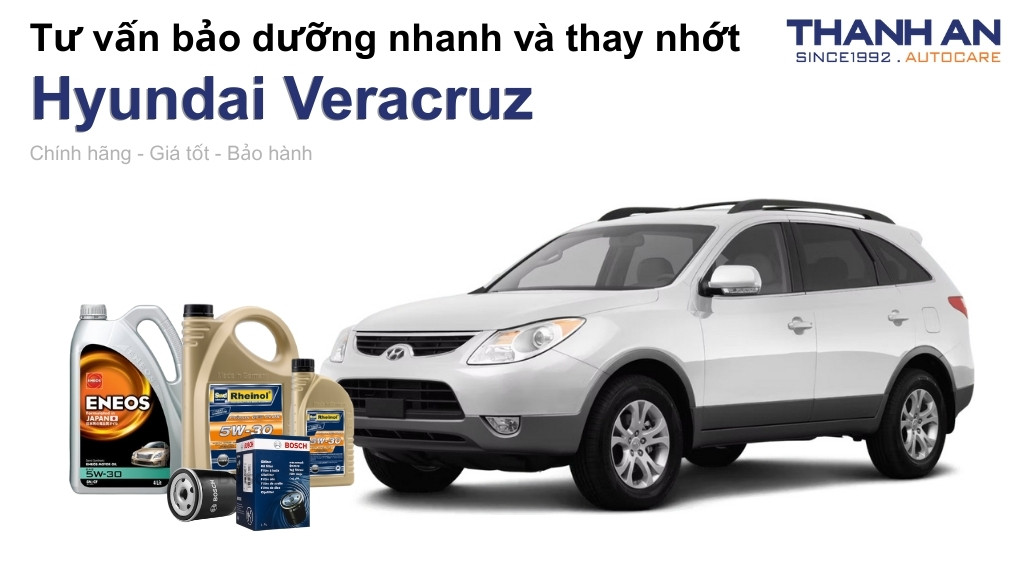 Động cơ Diesel 3.0L hoặc xăng 3.8L của Veracruz hoạt động với áp suất nén rất cao nên cần loại nhớt có màng dầu vững chắc. Thanh An Autocare ưu tiên tư vấn các dòng sản phẩm cao cấp từ thương hiệu Rheinol (Đức) và ENEOS (Nhật Bản). Hai thương hiệu này đáp ứng tốt các tiêu chuẩn khắt khe về khả năng chịu nhiệt và làm sạch muội than trong buồng đốt.