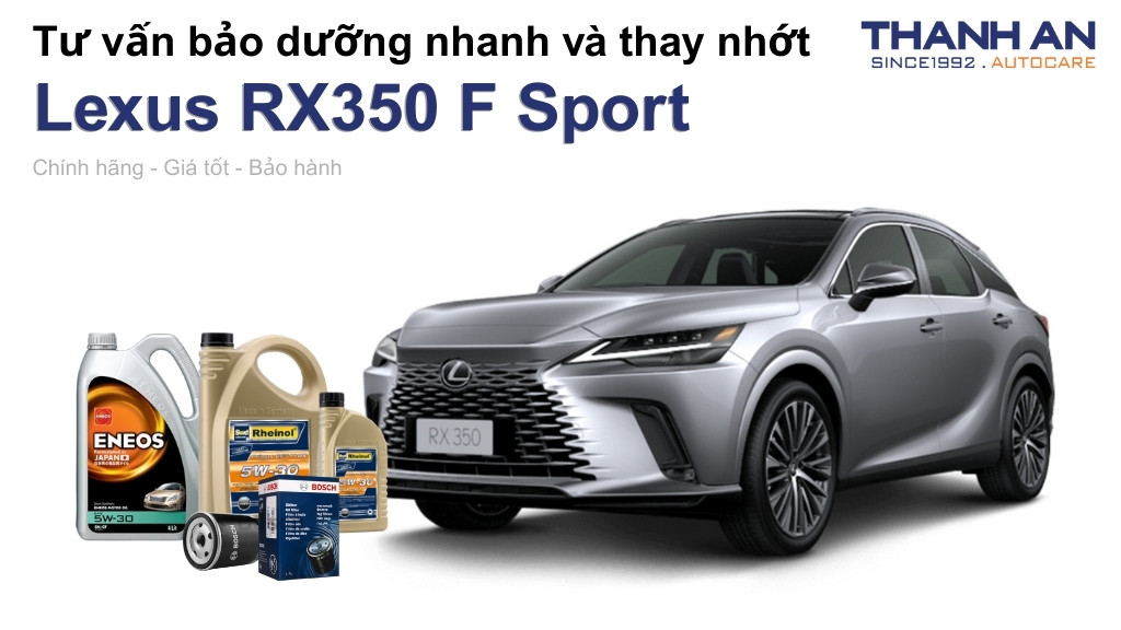 - Xe Lexus RX350 F Sport thay nhớt hãng hay nhớt ngoài tốt hơn? Cả hai đều tốt nếu sử dụng đúng nhớt chính hãng, nhưng thay nhớt xe Lexus RX350 F Sport tại Thanh An Autocare giúp bạn tiết kiệm chi phí đáng kể và thời gian chờ đợi ngắn hơn.
