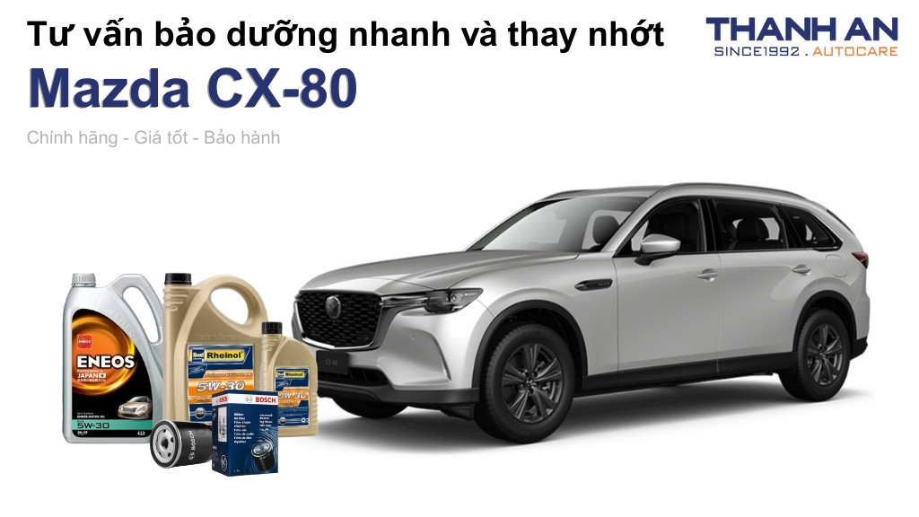 Động cơ Skyactiv thế hệ mới trên Mazda CX-80 đòi hỏi loại nhớt có độ loãng phù hợp để tối ưu khả năng tiết kiệm nhiên liệu. Thanh An Autocare luôn khuyến nghị khách hàng sử dụng các thương hiệu danh tiếng như Rheinol (Đức) và ENEOS (Nhật Bản) để bảo vệ động cơ toàn diện.
