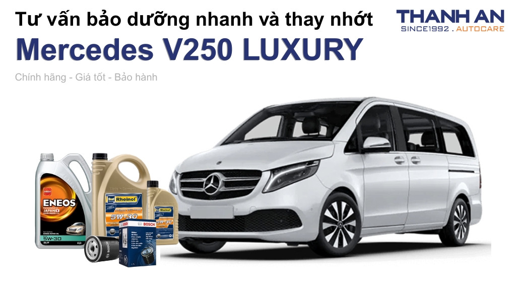 Mercedes V250 LUXURY là dòng MPV hạng sang hội tụ đầy đủ sự tiện nghi, không gian rộng rãi và hiệu suất vận hành ấn tượng. Để khối động cơ tăng áp đắt tiền này luôn hoạt động êm ái, chủ xe bắt buộc phải tuân thủ lịch trình bảo dưỡng nghiêm ngặt ngay khi xe báo đến hạn. Thanh An Autocare sẽ cung cấp những thông tin kỹ thuật chính xác nhất giúp bạn an tâm khi thay nhớt xe Mercedes V250 LUXURY.
