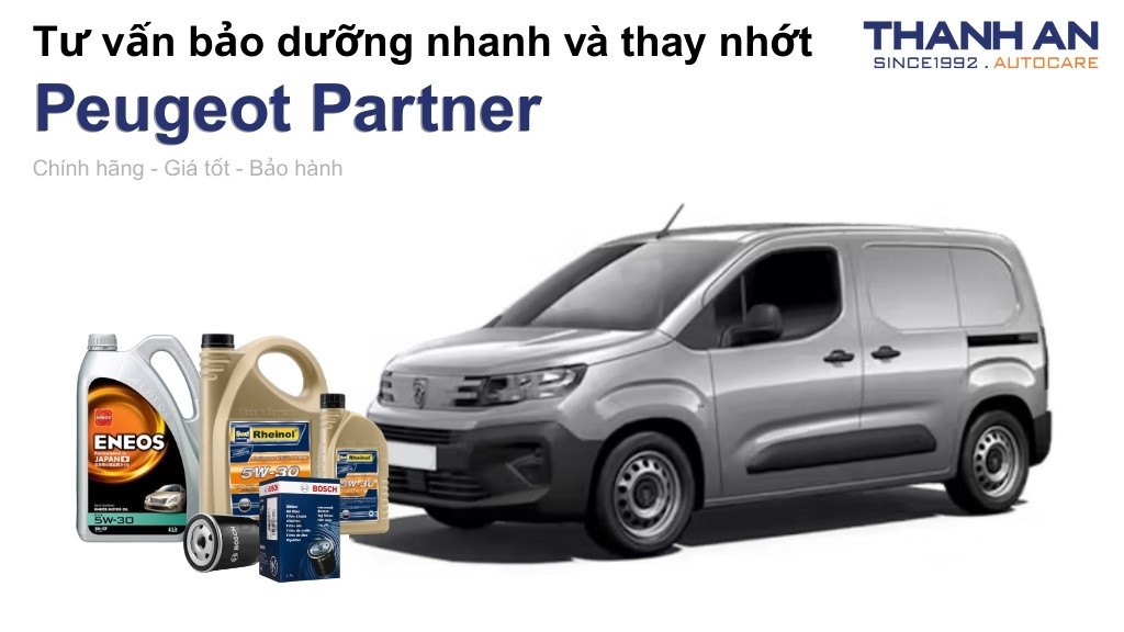 Động cơ Châu Âu của Peugeot Partner đòi hỏi tiêu chuẩn dầu nhớt khắt khe nhằm bảo vệ hệ thống xử lý khí thải và Turbo tăng áp. Thanh An Autocare khuyến nghị khách hàng sử dụng các thương hiệu danh tiếng toàn cầu như Rheinol và ENEOS. Hai dòng sản phẩm này đáp ứng tốt các tiêu chuẩn kỹ thuật cao, giúp xe vận hành êm ái dưới áp lực tải trọng lớn.