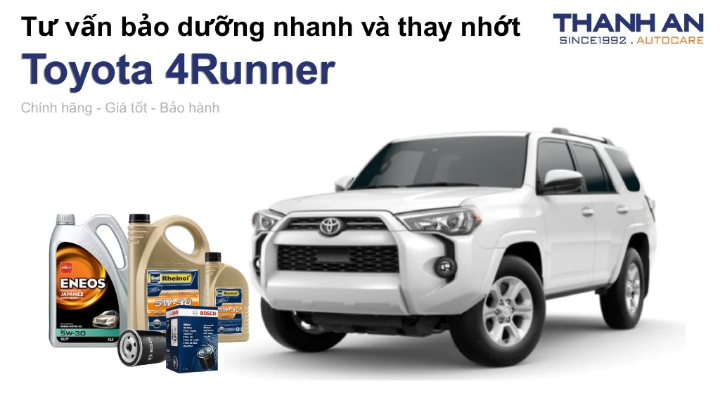Bạn đang sở hữu "mãnh thú" địa hình Toyota 4Runner và muốn duy trì sức mạnh vượt trội cho khối động cơ V6 bền bỉ? Việc bảo dưỡng định kỳ với dòng nhớt chất lượng cao là yếu tố then chốt giúp xe chinh phục mọi cung đường khó khăn nhất. Hãy cùng Thanh An Autocare tìm hiểu quy trình thay nhớt xe Toyota 4Runner chuẩn chuyên gia để tối ưu hóa hiệu suất vận hành.