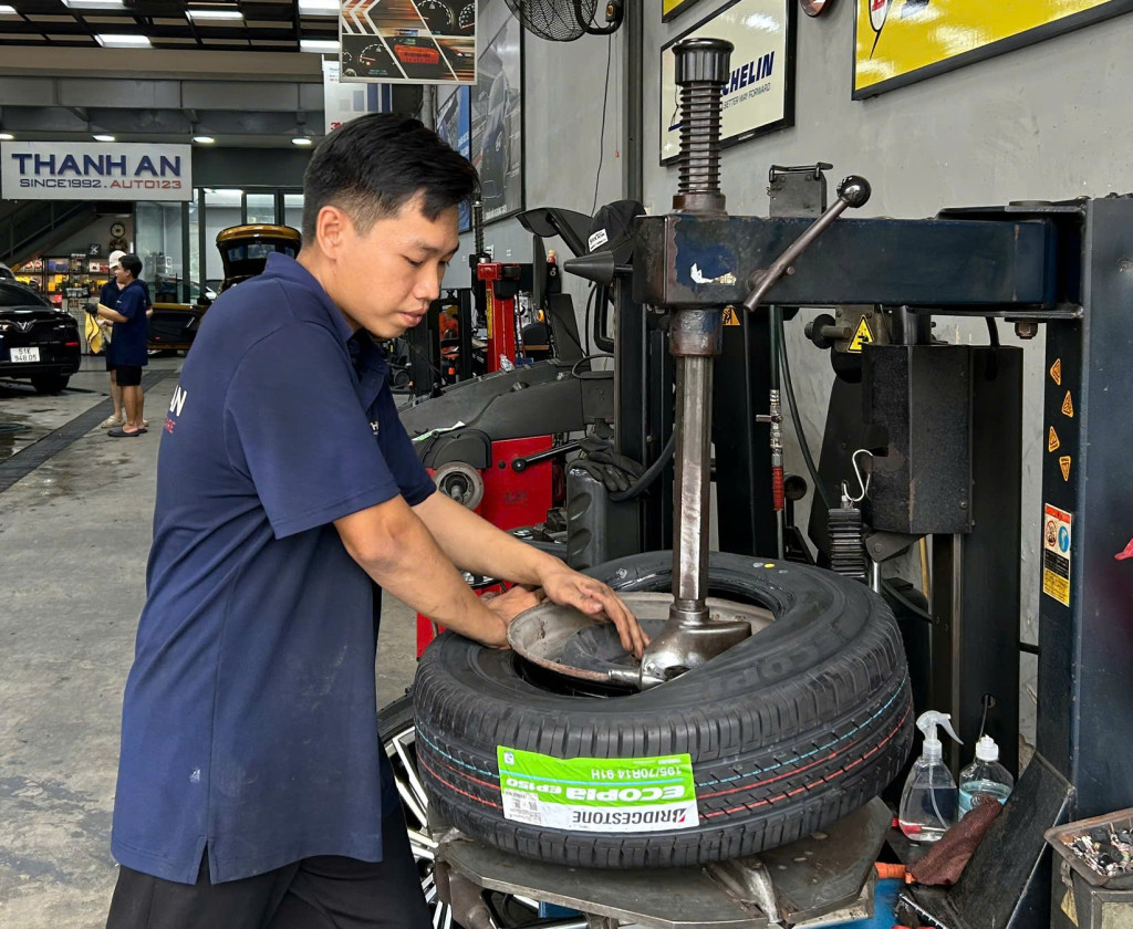 - Đưa lốp mới vào trục và tiến hành ngược lại với thao tác tháo lốp.