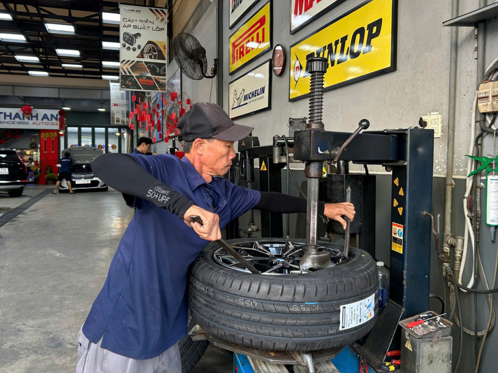 - Đưa lốp mới vào trục và tiến hành ngược lại với thao tác tháo lốp.