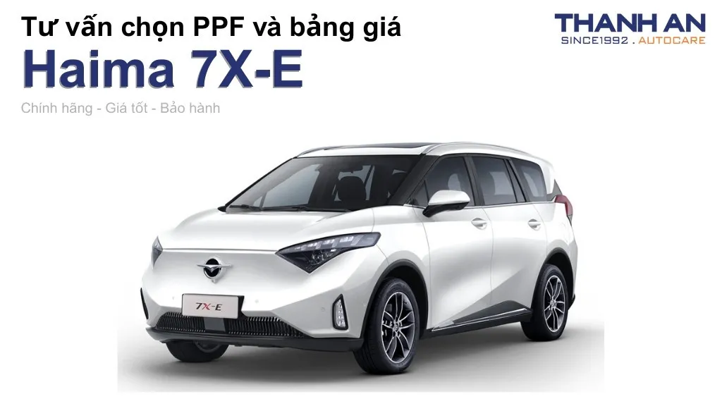 Dán PPF cho Haima 7X-E là giải pháp tối ưu để bảo vệ vẻ đẹp và giá trị của chiếc xe điện hiện đại này. Với khả năng chống trầy xước, tự phục hồi và ngăn ngừa ố vàng, lớp phim PPF sẽ giúp bạn luôn tự tin với diện mạo hoàn hảo của xế cưng. Thanh An Autocare cam kết mang đến chất lượng dịch vụ tốt nhất với các sản phẩm chính hãng.