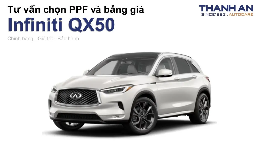 Dán PPF cho xe Infiniti QX50 là sự đầu tư xứng đáng để bảo vệ vẻ đẹp sang trọng và giá trị lâu dài của chiếc xe. Giải pháp này giúp bạn hoàn toàn trút bỏ nỗi lo về những vết trầy xước không mong muốn trong quá trình sử dụng. Thanh An Autocare cam kết mang đến chất lượng dịch vụ tốt nhất để đồng hành cùng đam mê xe của bạn.
