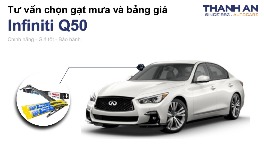 Thanh An Autocare tự hào là địa chỉ tin cậy chuyên cung cấp gạt mưa chính hãng cho các dòng xe sang tại TP.HCM. Chúng tôi thấu hiểu những yêu cầu khắt khe về kỹ thuật của dòng xe Infiniti Q50. Bạn sẽ hoàn toàn hài lòng với chất lượng sản phẩm và dịch vụ tại đây.