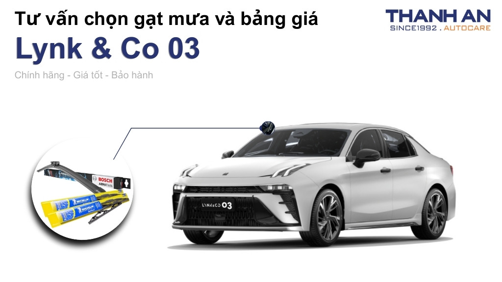 Thanh An Autocare là địa chỉ tin cậy chuyên cung cấp gạt mưa Bosch và Michelin chính hãng tại TP.HCM. Chúng tôi hiểu rõ cấu tạo kỹ thuật của Lynk & Co 03 và cam kết cung cấp đúng mã sản phẩm, đúng kích thước.
