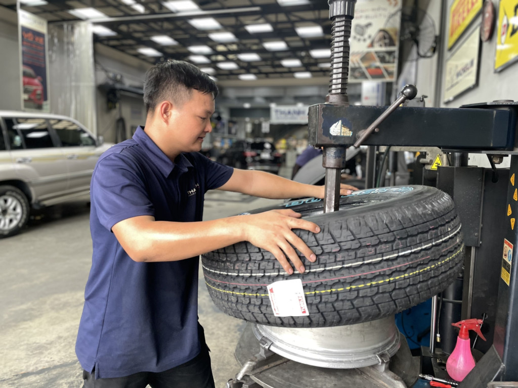 - Đưa lốp mới vào trục và tiến hành ngược lại với thao tác tháo lốp.