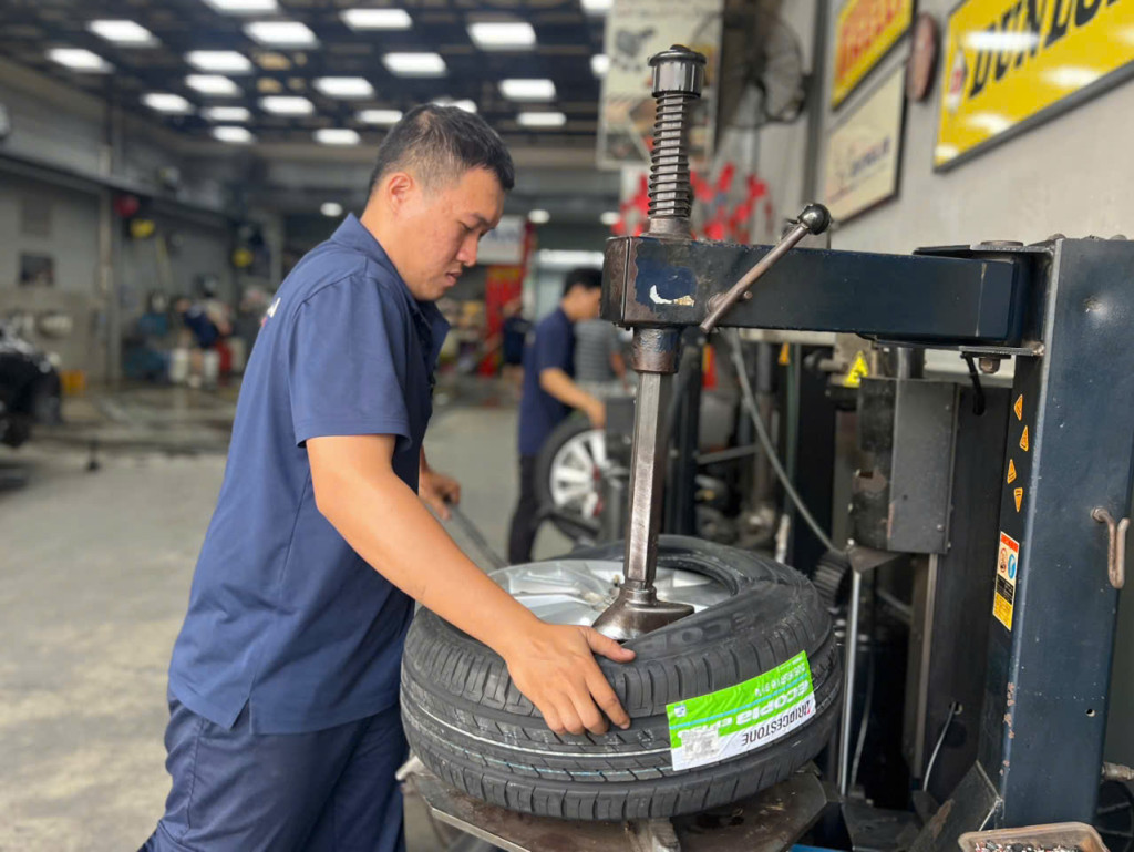 Khách hàng thay lốp xe ô tô tại cửa hàng của Thanh An Autocare quận 7