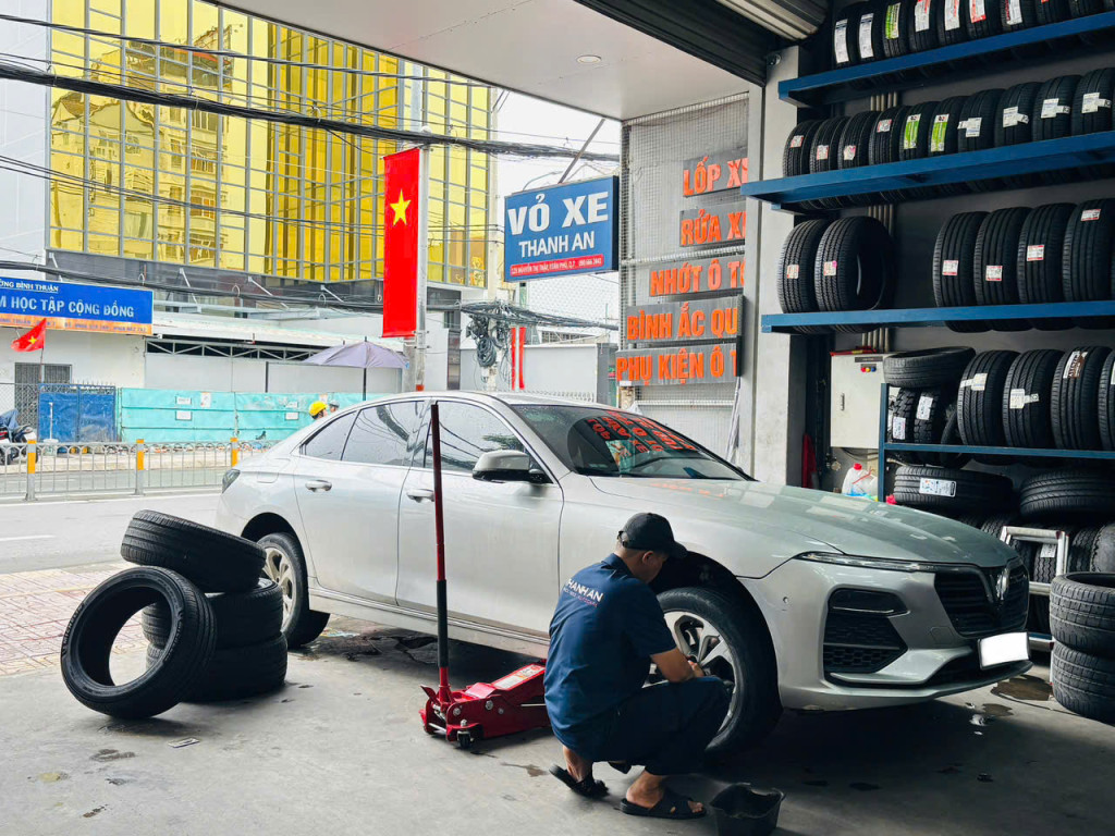 Khách hàng thay lốp xe ô tô tại cửa hàng của Thanh An Autocare quận 7