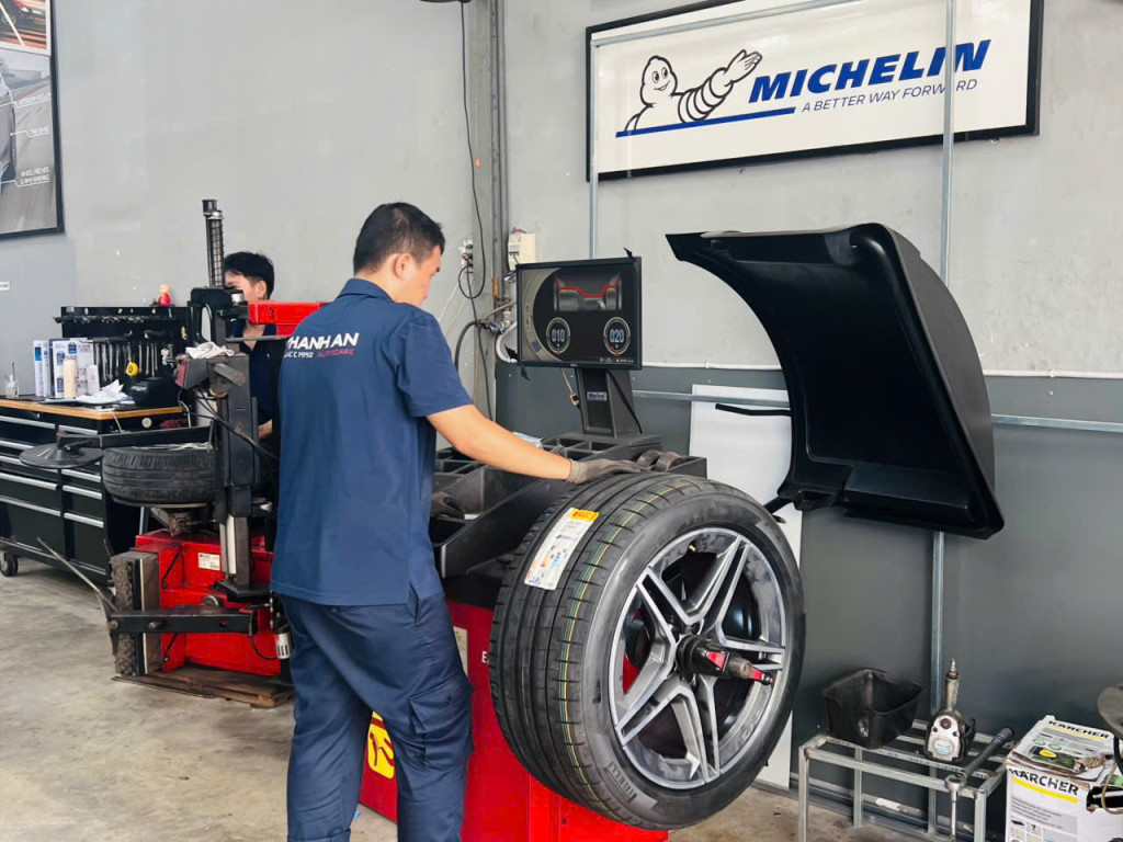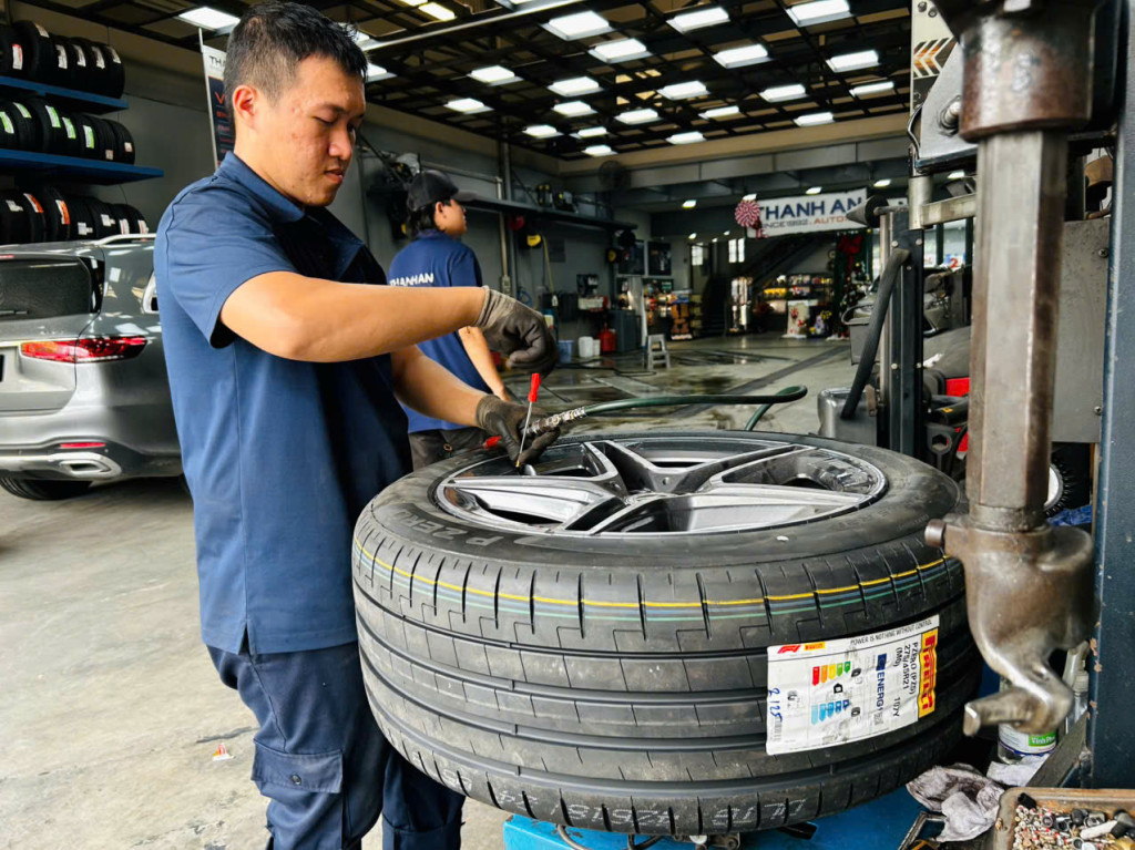 Khách hàng thay lốp xe ô tô tại cửa hàng của Thanh An Autocare quận 7