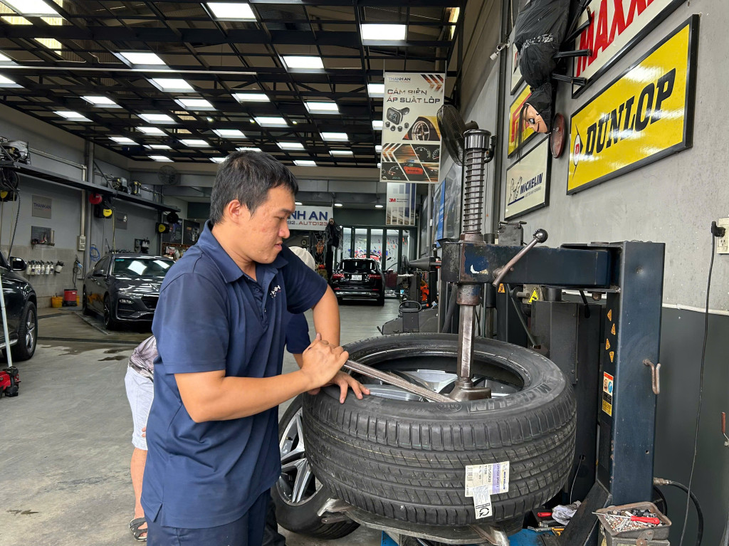 - Đưa lốp mới vào trục và tiến hành ngược lại với thao tác tháo lốp.