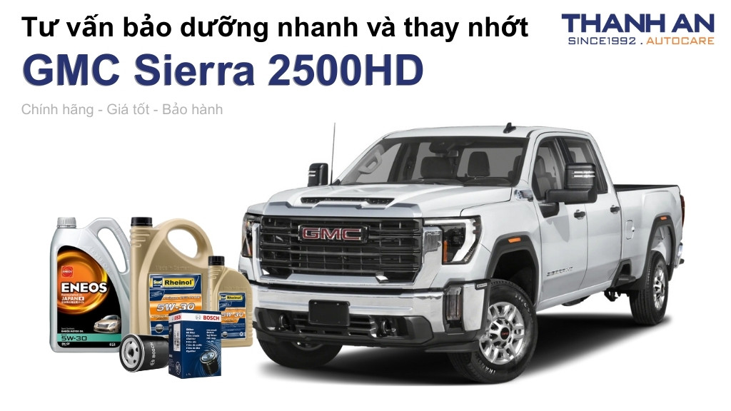 GMC Sierra 2500HD là mẫu bán tải hạng nặng sở hữu sức kéo vượt trội cùng động cơ Duramax mạnh mẽ cần chế độ chăm sóc đặc biệt để duy trì hiệu suất. Khi xe đã đến chu kỳ bảo dưỡng, tìm kiếm dòng dầu bôi trơn chịu tải cao là yếu tố quyết định đến độ bền của hệ thống Turbo và pít-tông. Thanh An Autocare sẽ cung cấp giải pháp toàn diện giúp bạn an tâm tuyệt đối khi thay nhớt xe GMC Sierra 2500HD.