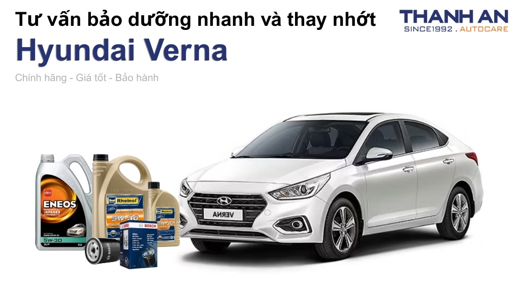 Động cơ của Hyundai Verna yêu cầu loại dầu nhớt có khả năng bôi trơn nhanh và chịu nhiệt tốt trong điều kiện giao thông đô thị. Thanh An Autocare ưu tiên tư vấn khách hàng sử dụng các dòng sản phẩm từ thương hiệu Rheinol (Đức) và ENEOS (Nhật Bản). Hai thương hiệu này cung cấp màng dầu bền vững, giúp giảm ma sát tối đa giữa pít-tông và lòng xi-lanh.