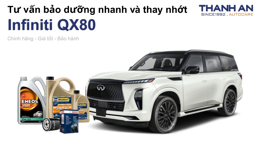 Động cơ V8 5.6L của Infiniti QX80 sinh ra nhiệt lượng rất lớn trong quá trình vận hành nên yêu cầu loại dầu nhớt có khả năng chịu nhiệt và bôi trơn vượt trội. Thanh An Autocare khuyến nghị khách hàng sử dụng các sản phẩm từ thương hiệu danh tiếng như Rheinol và ENEOS.
