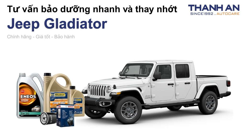 - Xe Jeep Gladiator thay nhớt hãng hay nhớt ngoài tốt hơn? Tại hãng và Thanh An Autocare đều sử dụng nhớt chính hãng, chất lượng cao. Tuy nhiên, thay nhớt tại Thanh An Autocare giúp bạn tiết kiệm chi phí đáng kể nhưng vẫn đảm bảo quy trình kỹ thuật nghiêm ngặt.