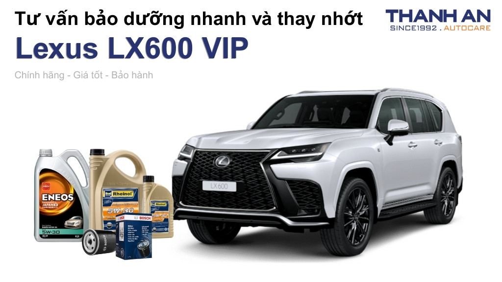 - Xe Lexus LX600 VIP thay nhớt hãng hay nhớt ngoài tốt hơn? Nhớt hãng và nhớt thương hiệu lớn (như ENEOS, Rheinol) đều tốt, nhưng khi thay nhớt cho xe Lexus LX600 VIP tại Thanh An Autocare, bạn sẽ tiết kiệm chi phí dịch vụ đáng kể mà vẫn hưởng quy trình 5 sao.