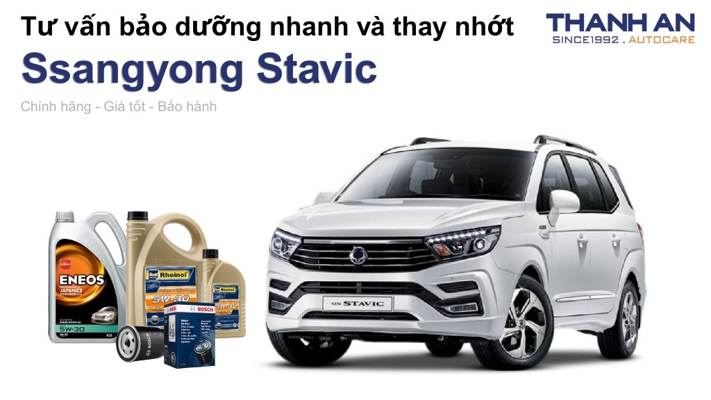 Ssangyong Stavic là mẫu xe MPV 9 chỗ sở hữu không gian rộng rãi và khối động cơ dầu mạnh mẽ. Để đảm bảo chiếc xe luôn vận hành êm ái trên mọi hành trình, bạn cần chú trọng đến quy trình bảo dưỡng định kỳ. Hãy cùng Thanh An Autocare tìm hiểu chi tiết về giải pháp thay nhớt xe Ssangyong Stavic giúp tối ưu hóa hiệu suất và tuổi thọ động cơ.